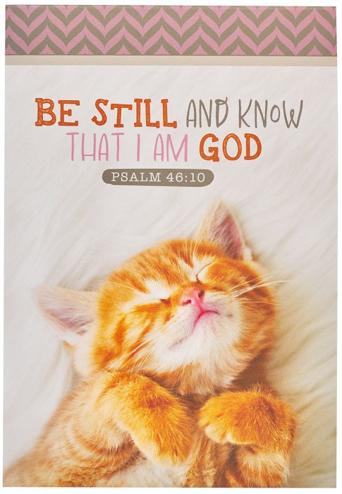 This notepad's front cover features an adorable ginger kitten resting against a fluffy white background accompanied by a striped pink and gray border at the top. The sentiment from Psalm 46:10 is printed in orange, pink, and gray font to match.