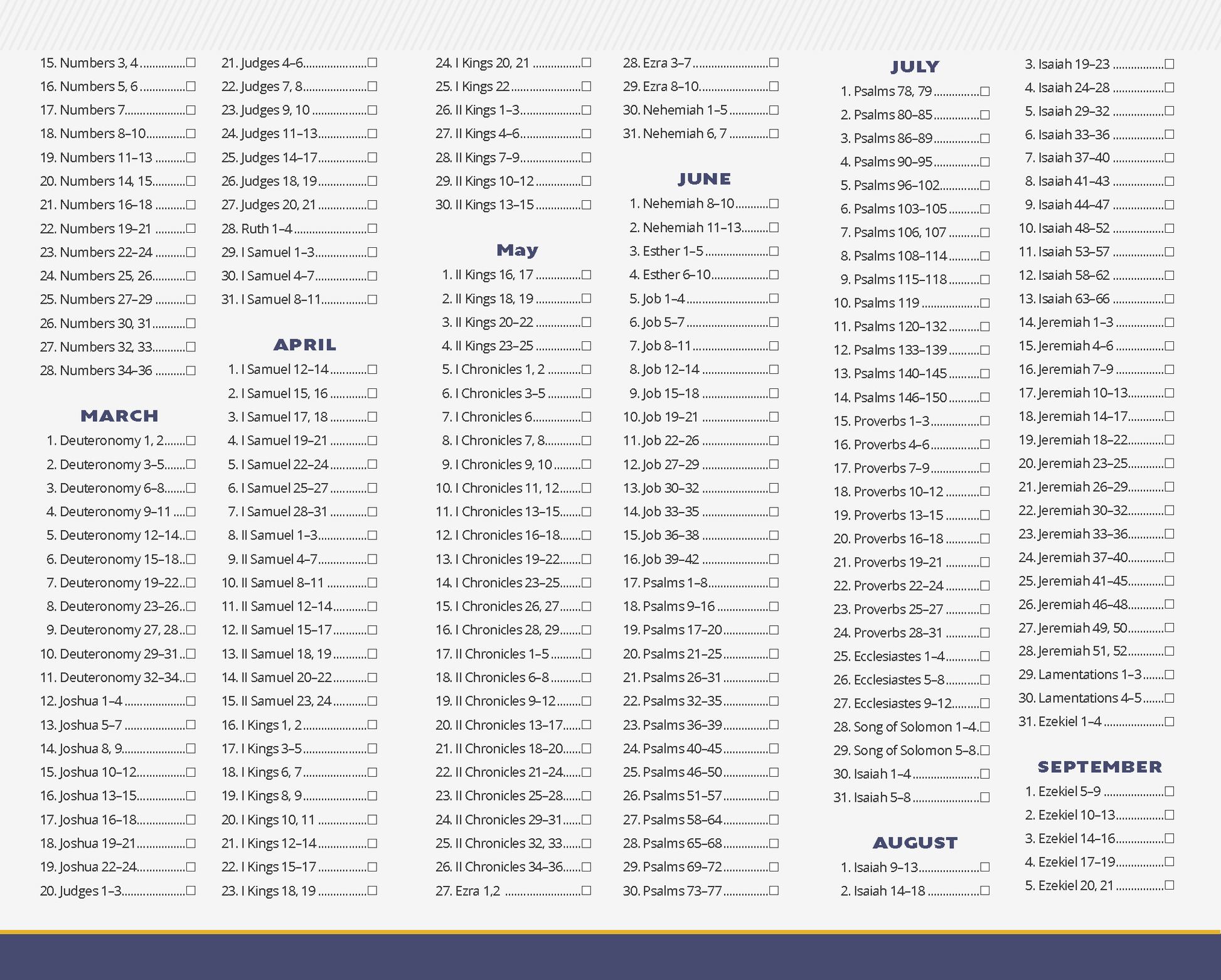 This 1-year Bible reading schedule is sure to meet your need for tracking your daily reading activity. Measuring just 3¼" x 8", the trifold sheet will fit nicely in your Bible, Bible cover or your daily journal. This crisp, full-color brochure has been designed with easy-to-read print and comes in packs of 25...perfect for church distribution!