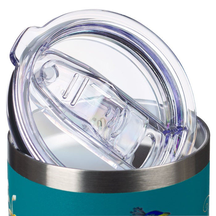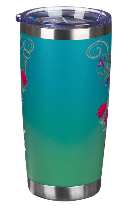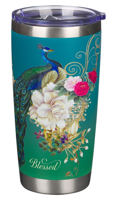 This stainless steel tumbler itself is a remarkable work of art, adorned with a raised blue peacock and floral design. The combination of metallic gold flourishes, enchanting peacock, and delicate flowers creates an atmosphere reminiscent of a secret garden. To add to the intriguing design, a gold key is discreetly hidden within this captivating scene. The sentiment, Blessed - Jeremiah 17:7, is elegantly presented in cream-colored letters, adding an element of timeless beauty.