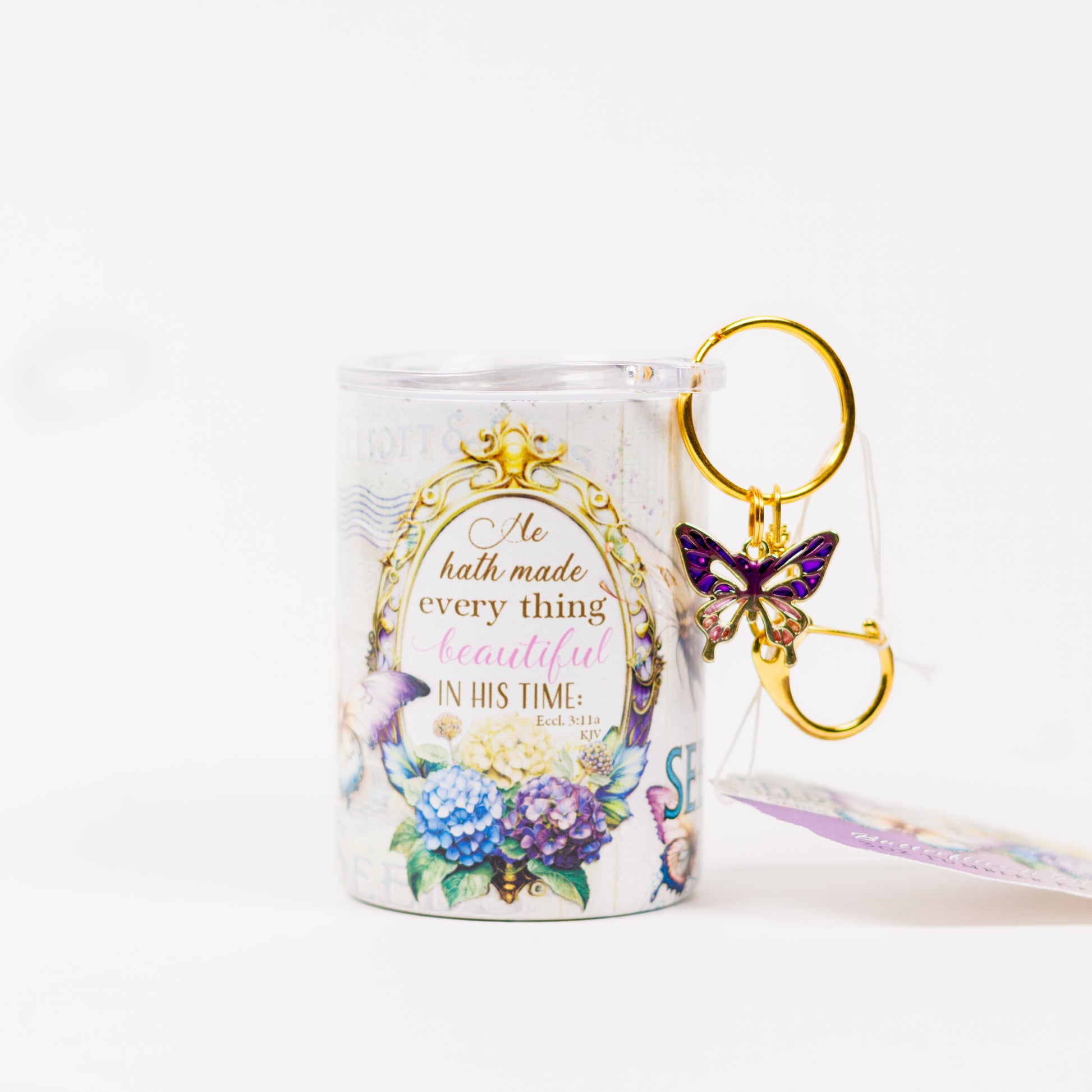 This charming mini tumbler keychain from the Butterflies & Blooms gift collection features Ecclesiastes 3:11, “He hath made every thing beautiful in His time.” Its delicate design showcases butterflies and hydrangeas in a vintage postcard style. Complete with a secure lid and a gold-tone keyring accented by a butterfly charm, this mini tumbler can even hold a shot of espresso for those quick pick-me-ups. Clip it to your keys, bag, or backpack for a stylish reminder of God’s perfect timing wherever you go. Stainless steel straw included.