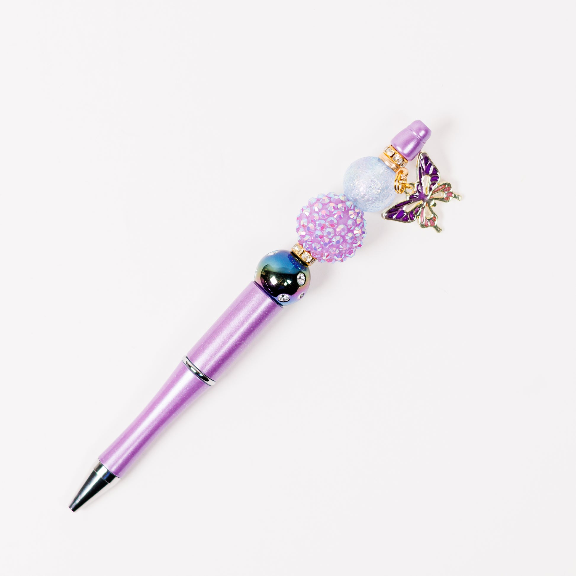 Add a touch of elegance to your everyday writing with this stunning beaded pen from the Butterflies & Blooms gift collection. Featuring a shimmering lavender barrel and topped with three decorative beads in coordinating hues, this pen is accented by a delicate butterfly charm for a graceful finish. Perfect for journaling, note-taking or gifting, it’s a thoughtful addition to any stationery collection.