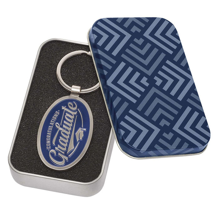 A vibrant blue enamel beautifully surrounds the embossed laser-engraved congratulatory message, Congratulations Graduate. The image of a graduation cap adds to the celebratory feel. A silver border circles the enamel and covers the back. The back is stamped with the life lesson, Expect Nothing. Appreciate Everything. Nestled in its very own metal tin, this is a lovely gift for any graduate.