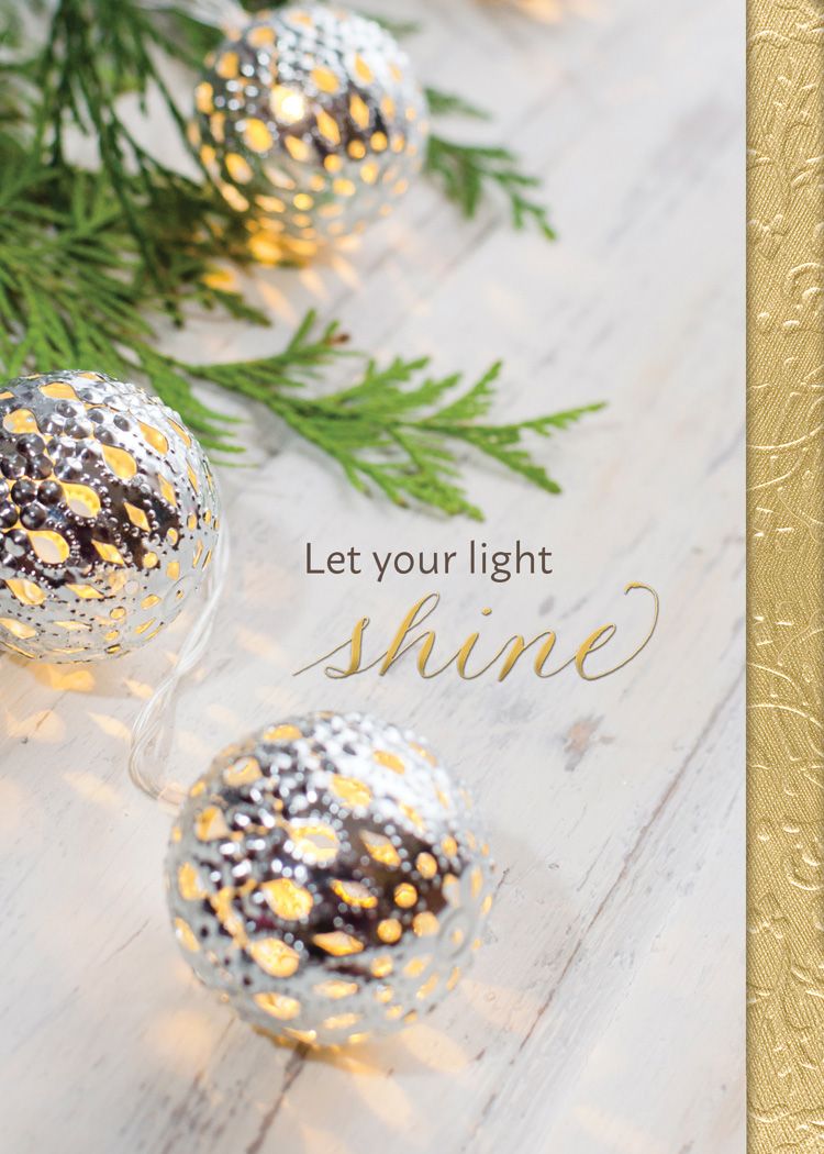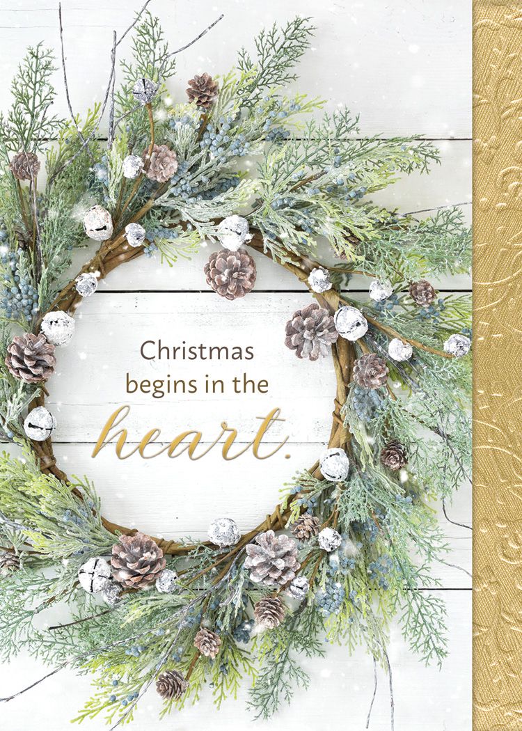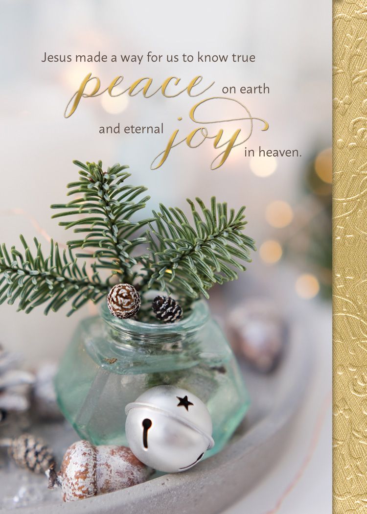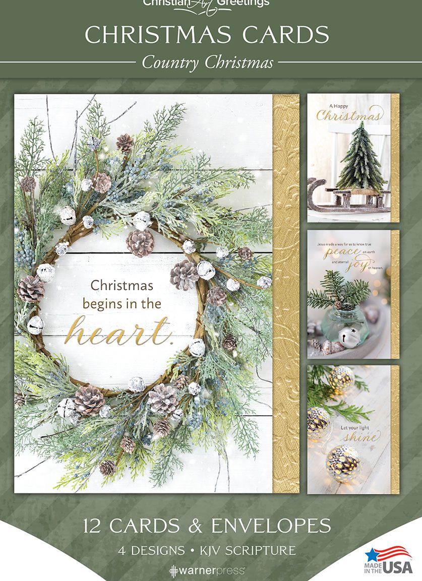 These Christmas scenes are peaceful reminders of simpler times and the comfort of home. This assortment features 4 different photographic images: pine wreath on white shiplap; pine branch in glass vase; small pine tree on rustic sled; pine branch with 3 silver ornaments. Cards measure 4¾" x 6¾", with 12 cards and envelopes per box, 3 each of 4 designs. Uses KJV Scripture.