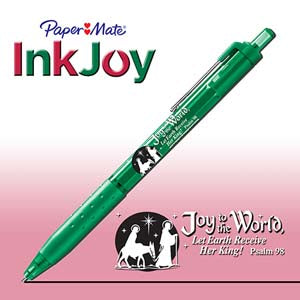This Christmas themed pen is a dream to write with, gliding like a gel pen yet fast-drying like a ballpoint. Bible-safe, no bleed, fade-proof; Scripture imprint Joy to the World, Let Earth Receive Her King! Psalm 98, with Christmas logo silhouette. The pen has a comfortable rubber grip for comfort writing; click-open mechanism, handy pocket clip; black ink.