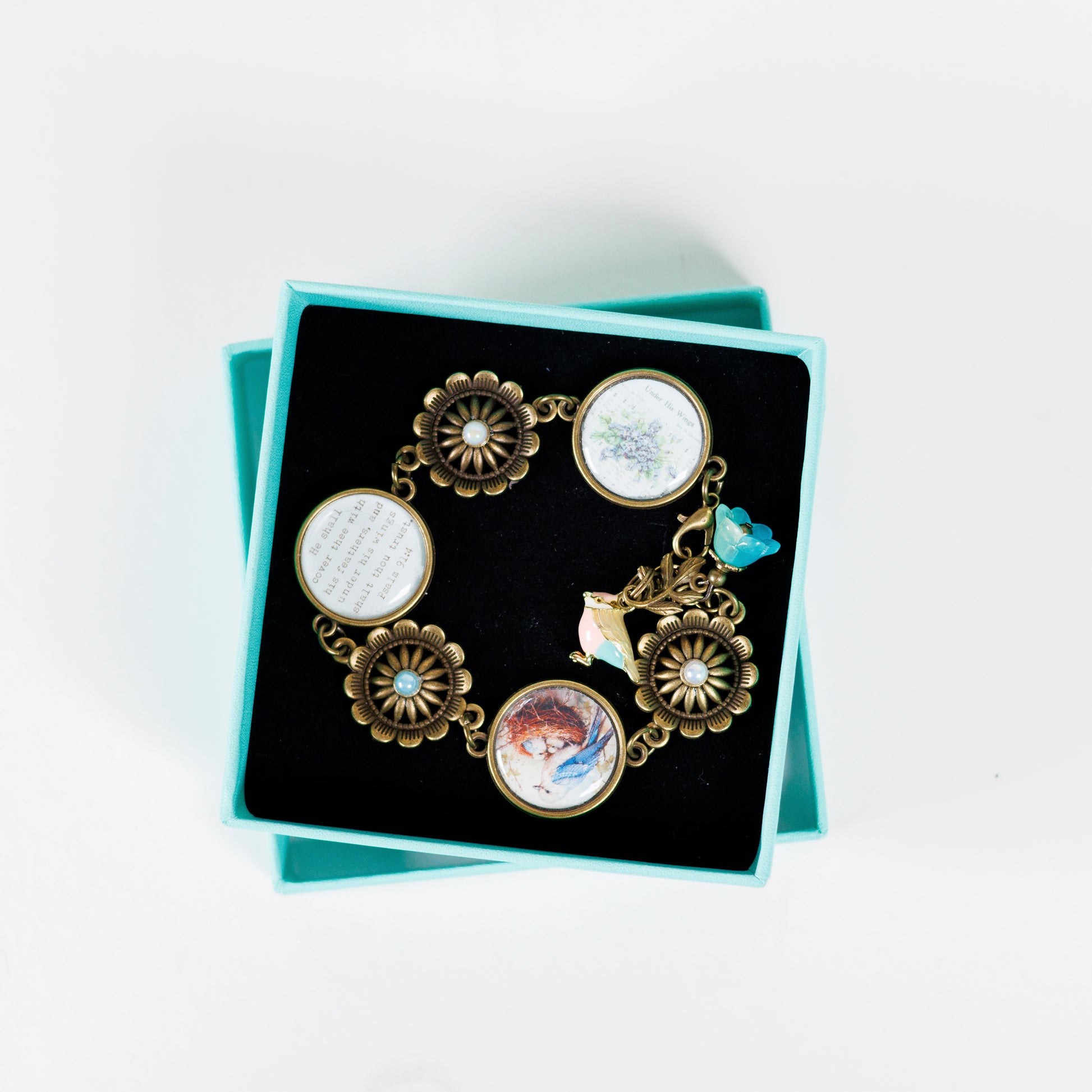 Wear a reminder of God’s care and protection with this antique bronze bracelet. This bracelet features Psalm 91:4 along with coordinating designs from the Under His Wings collection. Each round charm is framed with intricate floral accents. The adjustable chain includes a lobster clasp and delicate bead charms for a touch of color. A meaningful accessory that blends faith and timeless style. Comes packaged in a bright blue jewelry box.