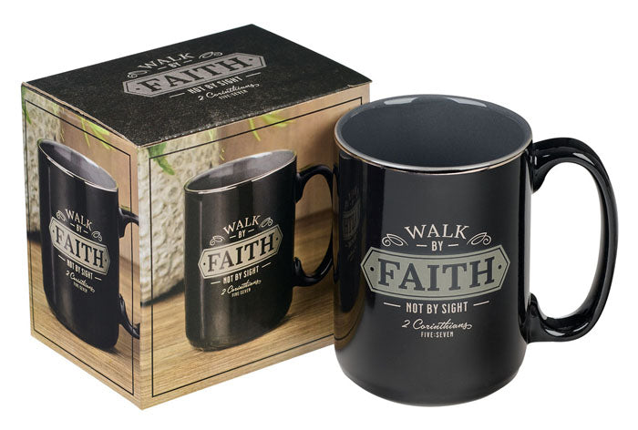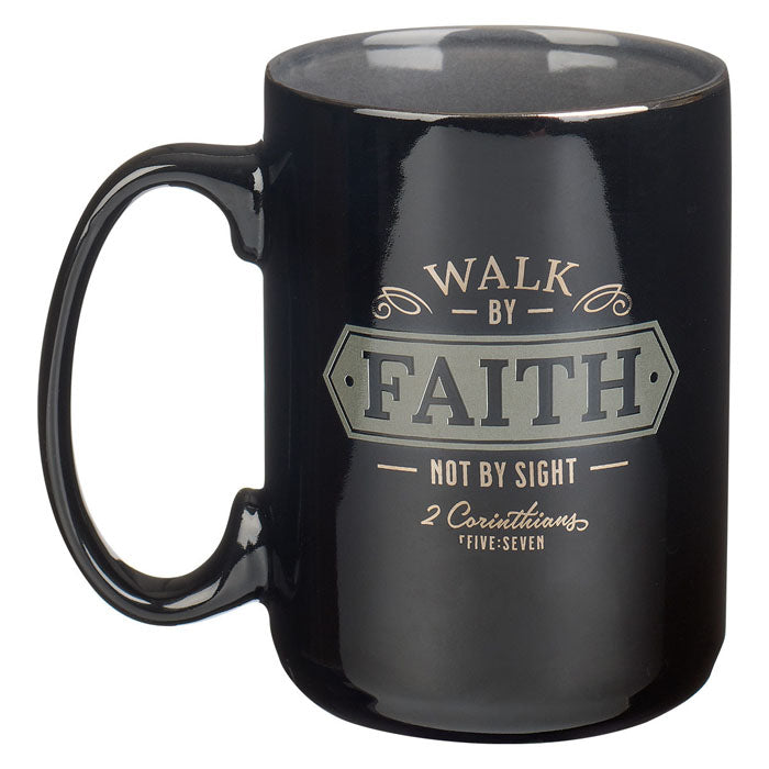 The glossy black exterior of this mug contrasts well with its matte gray interior. The same gray accent is used as a frame to highlight part of the sentiment presented in silver-foiled letters accented by framed black block letters. Front and back say, Walk by faith not by sight - 2 Corinthians 5:7. A wide black handle that comfortably holds three to four fingers extends to one side and offers a firm grip. Due to the delicate silver foil used in the decoration, the mug should not be used in a microwave, and we recommend handwashing it in warm soapy water.